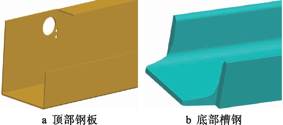 箱体框架为镀锌钢板焊接框架,底座为槽钢底座,底座集成有起吊和地脚固定装置,能保证足够的强度与刚度.箱体材料为Q235B,其杨氏模量为200 GPa,泊松比为0.3,材料的屈服强度为235 MPa,抗拉强度为375~460 MPa,许用应力取113 MPa.箱体框架的顶部及底部结构如图2所示.