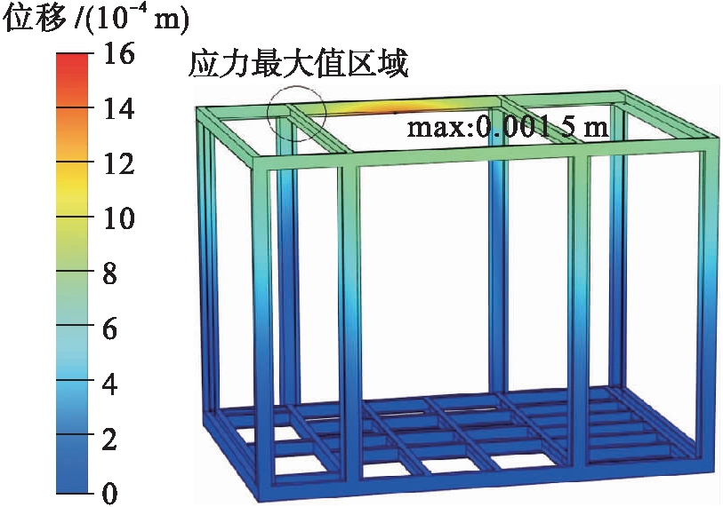 12级风工况下施工电源框架应力分布和位移云图如图5、6所示.由图5、6可以看出,零部件应力最大点发生在框架立柱上部与顶部连接处,大小为38 MPa,小于Q235B钢113 MPa的许用应力.最大变形发生在框架顶部中间部位,为1.5 mm.变形较大原因在于中间变压器体积较大,横梁也较长.因此可以判断,在12级风作用下,施工电源框架结构抗风压性能较好.