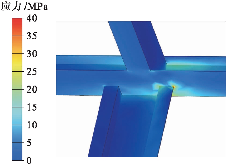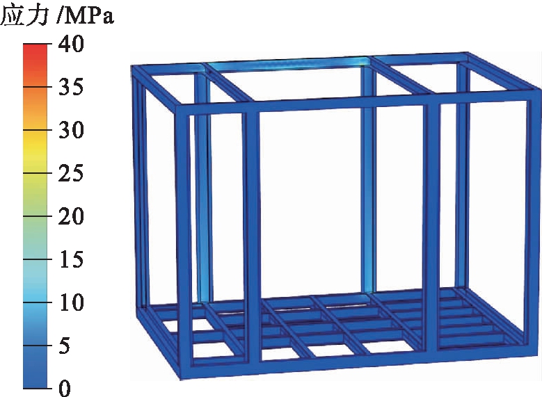 对施工电源应力最大值部位局部放大,结果如图7所示.从图7中可以看出,应力分布集中在立柱和横梁的连接处,此时应力仍较小,可以保证框架整体的结构强度.但同时由于施工电源放置地点通常环境恶劣,风荷载导致的振动将成为此处磨损的重要原因,因此,在维护过程中,应当对连接处的螺栓进行检查.