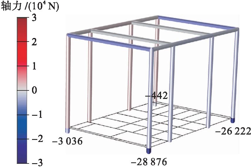 施工电源的侧面受风压作用产生风荷载及绕底座最外端点旋转的倾覆力矩.在实际运行过程中,施工电源的自身重力也产生了以最外端点为铰支点的抗倾覆力矩.在4个基座处各采用一个弹簧基础进行约束,通过考察近点处弹簧基础是否承受垂直方向的下压力来判定施工电源是否倾覆.将载荷施加于模型上,计算可得轴力如图9所示(单位:N).