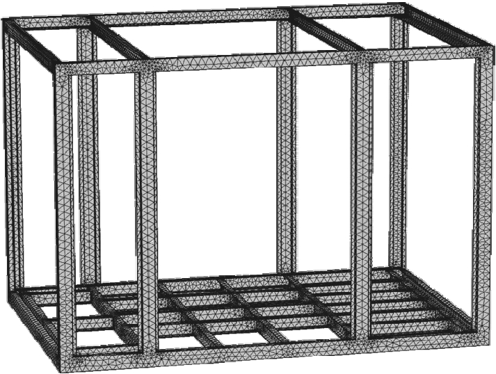 施工电源框架结构的破坏可能存在于任意位置,尤其是各个结构的连接处,故需要建立完整的三维模型进行计算.由于施工电源框架结构在实际使用中不能出现塑性变形,故在仿真计算中主要采用第四强度理论作为判断施工电源是否发生破坏的依据.同时在计算过程中,采用MISES应力对施工电源是否安全进行判断.运行Comsol软件,采用固体力学模块进行仿真计算,图3给出了施工电源框架结构的网格划分图像.