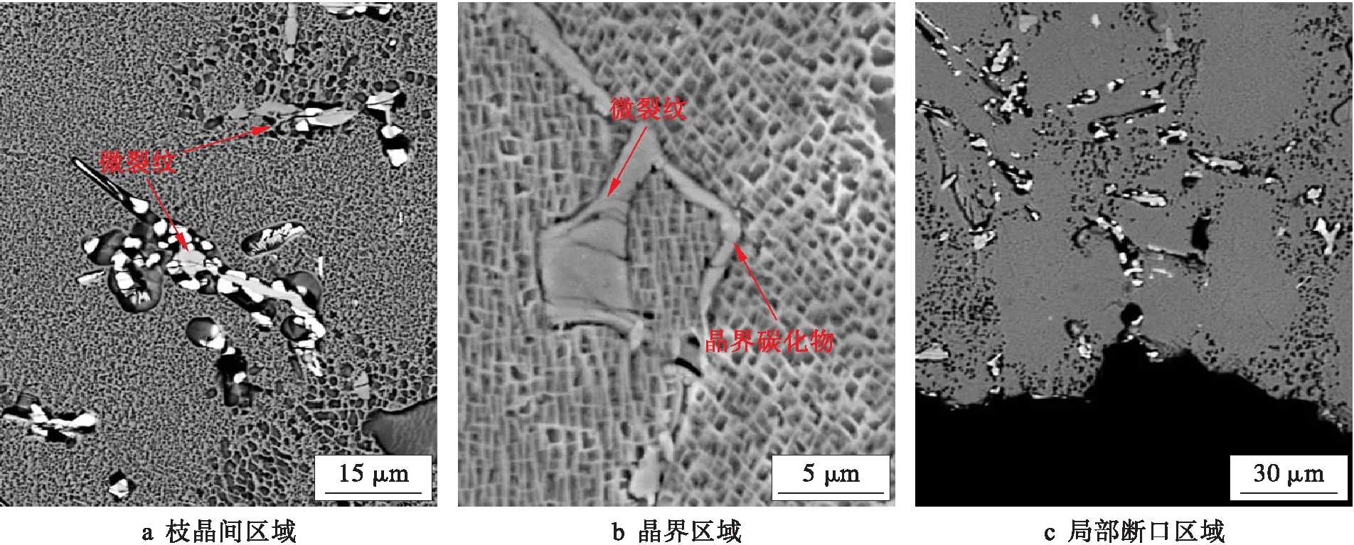 图2 高温合金枝晶间区域的共晶及碳化物形貌