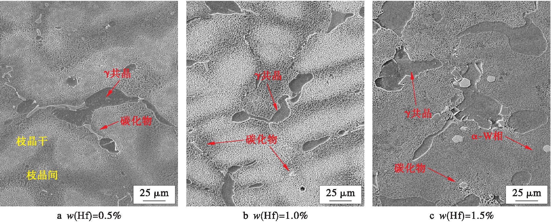 1) 随着高W镍基高温合金中Hf元素含量的增加,铸态合金的碳化物尺寸减小,含量降低,γ′共晶的尺寸和含量增加,铸态枝晶间距无显著变化.