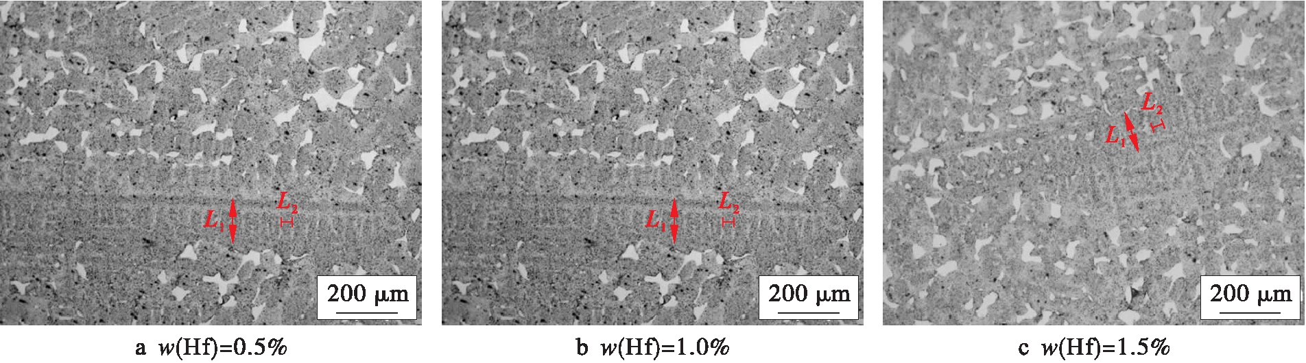 采用光学显微镜观察不同Hf含量合金的宏观组织形貌,结果如图1所示.不同合金中的一次、二次枝晶间距分别为L1、L2.由图1可见,0.5%Hf、1.0%Hf、1.5%Hf合金的一次、二次枝晶间距分别约为140、35 μm,130、35 μm以及125、35 μm.可见,随着Hf含量的增加,铸态合金的一次枝晶间距略有减小,但合金的二次枝晶间距无明显变化.这是由于Hf元素熔点较高(约为2 227 ℃),当合金发生凝固时,在相同初始温度下难熔元素含量较高的合金在凝固期间的凝固范围较窄,因而在液固转变期间可形成更多的枝晶构架,导致随着Hf含量的提高,合金的一次枝晶间距略有减小.