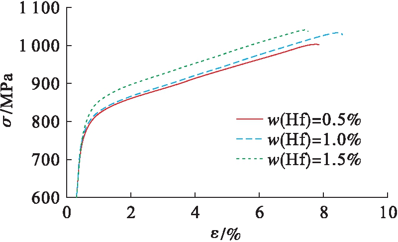 2) 随着Hf含量的增加,合金的室温拉伸屈服及抗拉强度略有增加,伸长率和断面收缩率变化不明显.