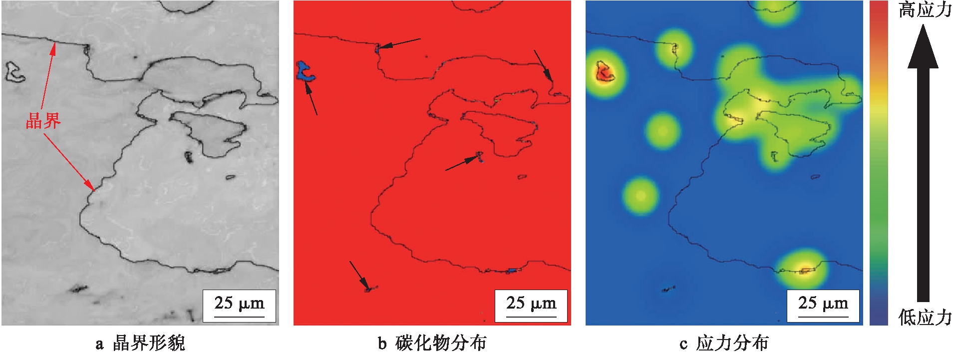 采用电子背散射衍射(SEM/EBSD)对1.0%Hf合金断口附近进行碳化物和应力分布分析,结果如图6所示.合金在室温拉伸过程中应力集中主要发生在碳化物处,且大尺寸碳化物处的应力集中值较高,同时晶界碳化物的应力集中程度高于晶内碳化物(见图6c).由此可以推断出,在合金室温拉伸过程中施加应力会引起碳化物处产生应力集中,并导致碳化物开裂形成裂纹源.碳化物周围的应力集中程度主要取决于该区域组织的协调变形能力,由于碳化物几乎无塑性[14],因而碳化物本身容易产生较大的应力集中,且应力集中程度随碳化物尺寸的增加而增加.由于晶界两侧的晶粒取向不同,协调变形能力低于单一晶粒,因此,晶界处也易产生应力集中,导致晶界处碳化物的应力集中程度高于晶内.