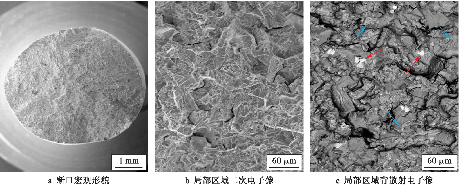 采用扫描电子显微镜观察1.0%Hf合金经室温拉伸断裂后的断口形貌,结果如图7所示.合金断口的宏观形貌较为平整(见图7a).合金断口主要呈现解理断裂特征[15],解理面上存在不同衬度的细小析出相,通过能谱分析可知,白色衬度为富W、Nb、Hf、Mo的MC碳化物(如图7c中红色箭头所示),浅灰色衬度为富Ti的MC碳化物(如图7c中蓝色箭头所示).结合图6分析结果可知,解理面处的碳化物为导致合金发生拉伸断裂的主要裂纹源.