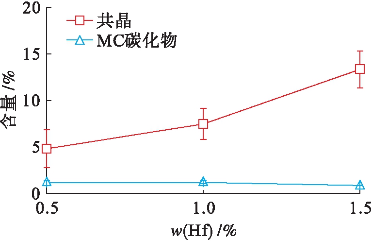 利用共晶组织和碳化物衬度以及合金中γ、γ′相的不同特点,采用Image-Pro软件对不同Hf含量合金中的共晶及碳化物面积占比进行统计分析,得到共晶、MC碳化物含量与Hf含量的关系,结果如图3所示.由图3可见,随着Hf含量的增加,合金中的共晶组织含量增加(分别约为4.8%、7.5%和13.4%),MC碳化物含量降低(分别约为1.2%、1.1%和0.8%).