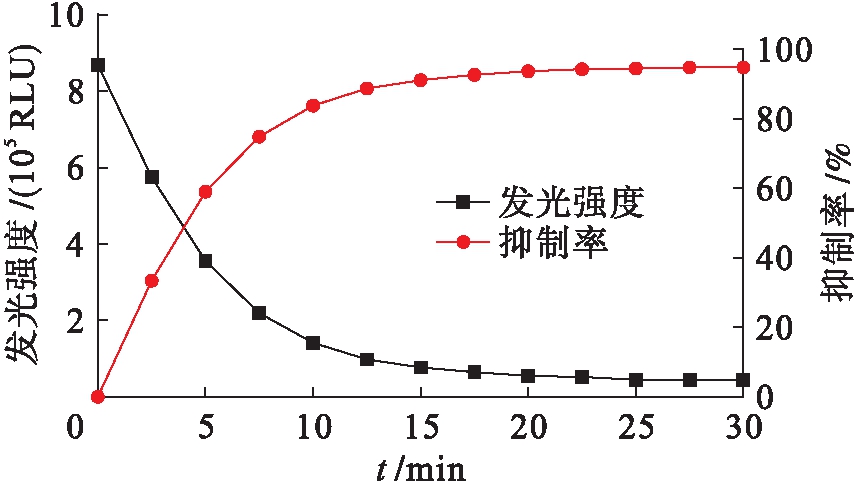 ISO 11348-3标准中规定的ZnSO4·7H2O参考浓度为19.34 mg/L,因此,有必要研究发光菌在20 mg/L ZnSO4·7H2O中发光强度随时间的变化规律.配置20 mg/L ZnSO4·7H2O作为参比毒物,研究该浓度ZnSO4·7H2O作用下费氏弧菌的发光强度和抑制率,结果如图3所示.
