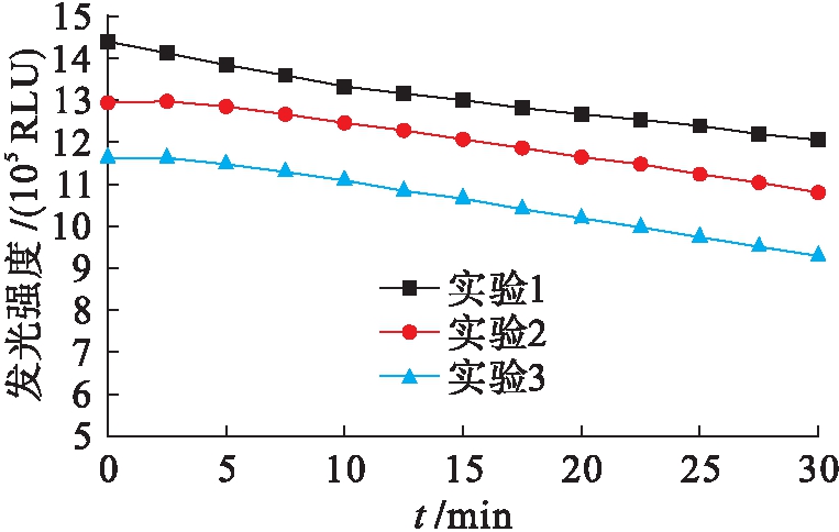 为了验证费式弧菌具有稳定的发光能力,同时考虑到室温不稳定会影响测量结果的准确性,因此,在恒温20 ℃下测量费式弧菌在阴性质控实验中的发光强度,实验中每2.5 min取一个测试点,直到30 min后结束实验,共进行三组实验,所得结果如图1所示.图1中RLU为相对发光强度单位,其数值随着测试设备的型号变化而改变.