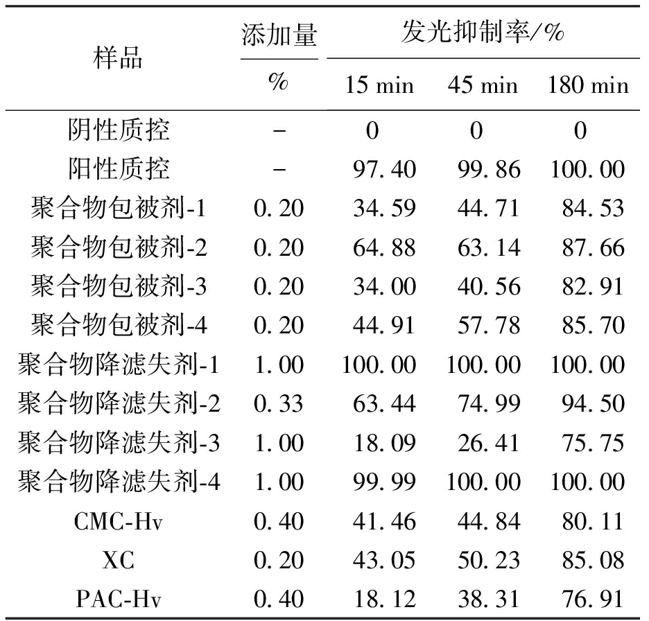 样品添加量%发光抑制率/%15min45min180min阴性质控-000阳性质控-97.4099.86100.00聚合物包被剂-10.2034.5944.7184.53聚合物包被剂-20.2064.8863.1487.66聚合物包被剂-30.2034.0040.5682.91聚合物包被剂-40.2044.9157.7885.70聚合物降滤失剂-11.00100.00100.00100.00聚合物降滤失剂-20.3363.4474.9994.50聚合物降滤失剂-31.0018.0926.4175.75聚合物降滤失剂-41.0099.99100.00100.00CMC-Hv0.4041.4644.8480.11XC0.2043.0550.2385.08PAC-Hv0.4018.1238.3176.91