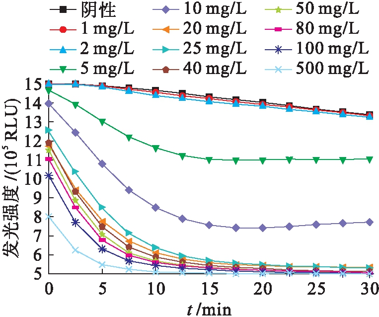 依据ISO 11348-3标准方法要求,选择易溶、稳定、常见、价廉、对人和环境危害小的ZnSO4·7H2O为毒性参照物,考察了不同浓度ZnSO4·7H2O对费式弧菌发光强度的影响,结果如图2所示.