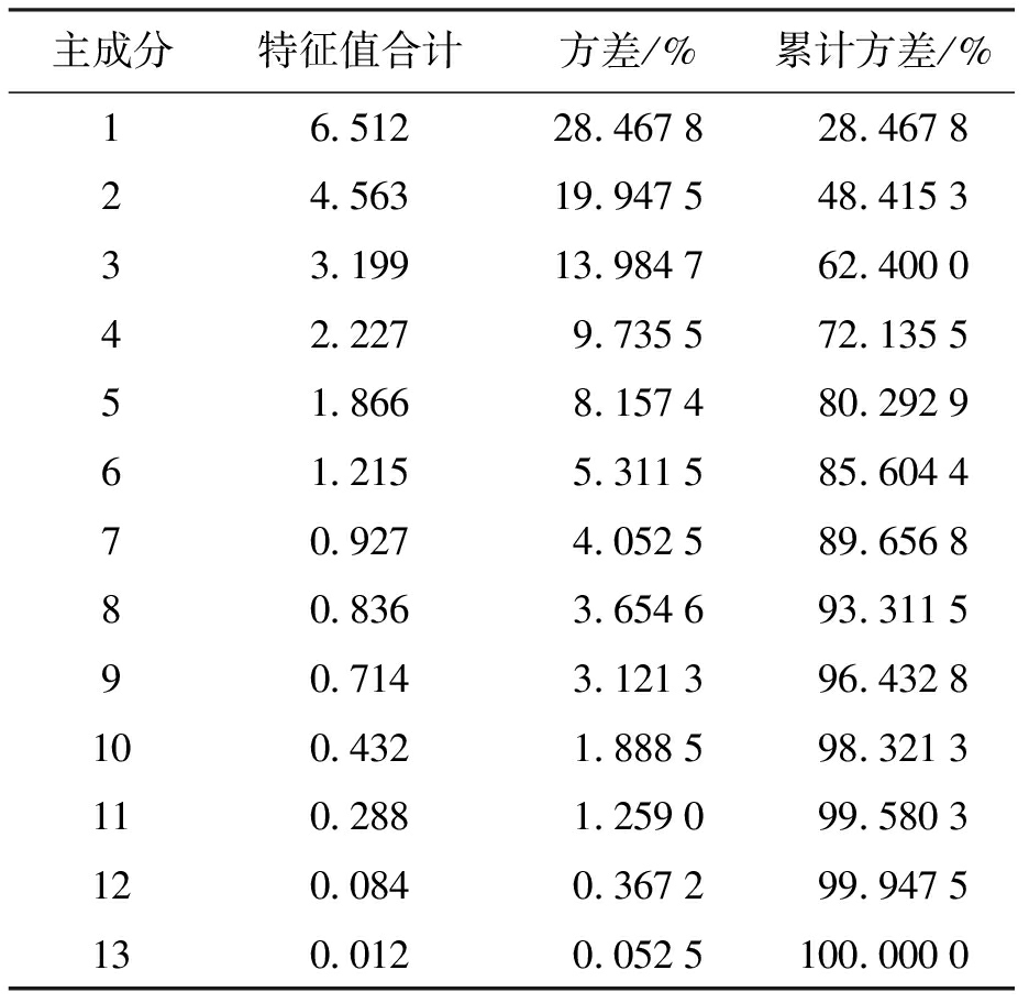 主成分特征值合计方差/%累计方差/%16.51228.467828.467824.56319.947548.415333.19913.984762.400042.2279.735572.135551.8668.157480.292961.2155.311585.604470.9274.052589.656880.8363.654693.311590.7143.121396.4328100.4321.888598.3213110.2881.259099.5803120.0840.367299.9475130.0120.0525100.0000