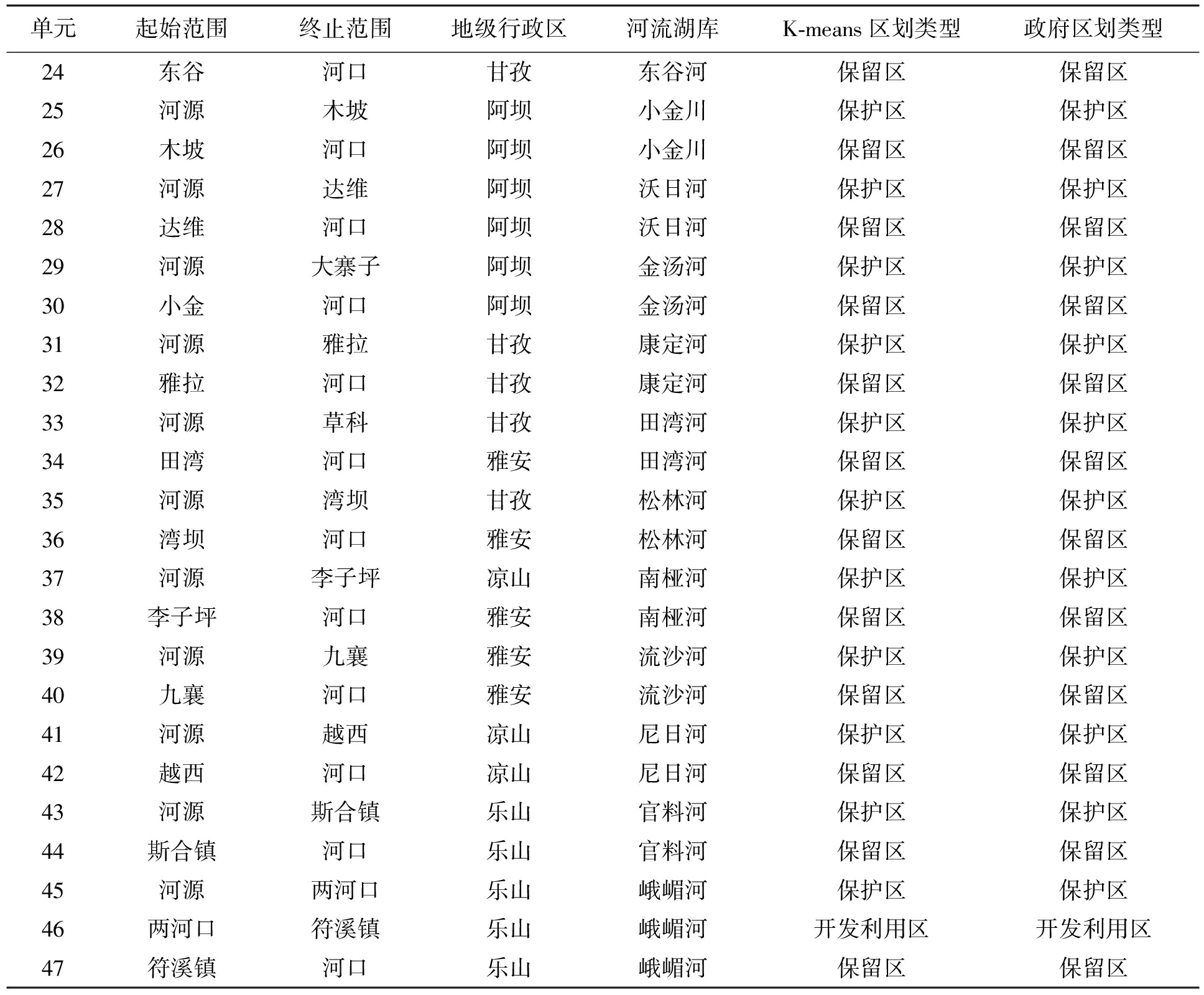 单元起始范围终止范围地级行政区河流湖库K-means区划类型政府区划类型24东谷河口甘孜东谷河保留区保留区25河源木坡阿坝小金川保护区保护区26木坡河口阿坝小金川保留区保留区27河源达维阿坝沃日河保护区保护区28达维河口阿坝沃日河保留区保留区29河源大寨子阿坝金汤河保护区保护区30小金河口阿坝金汤河保留区保留区31河源雅拉甘孜康定河保护区保护区32雅拉河口甘孜康定河保留区保留区33河源草科甘孜田湾河保护区保护区34田湾河口雅安田湾河保留区保留区35河源湾坝甘孜松林河保护区保护区36湾坝河口雅安松林河保留区保留区37河源李子坪凉山南桠河保护区保护区38李子坪河口雅安南桠河保留区保留区39河源九襄雅安流沙河保护区保护区40九襄河口雅安流沙河保留区保留区41河源越西凉山尼日河保护区保护区42越西河口凉山尼日河保留区保留区43河源斯合镇乐山官料河保护区保护区44斯合镇河口乐山官料河保留区保留区45河源两河口乐山峨嵋河保护区保护区46两河口符溪镇乐山峨嵋河开发利用区开发利用区47符溪镇河口乐山峨嵋河保留区保留区