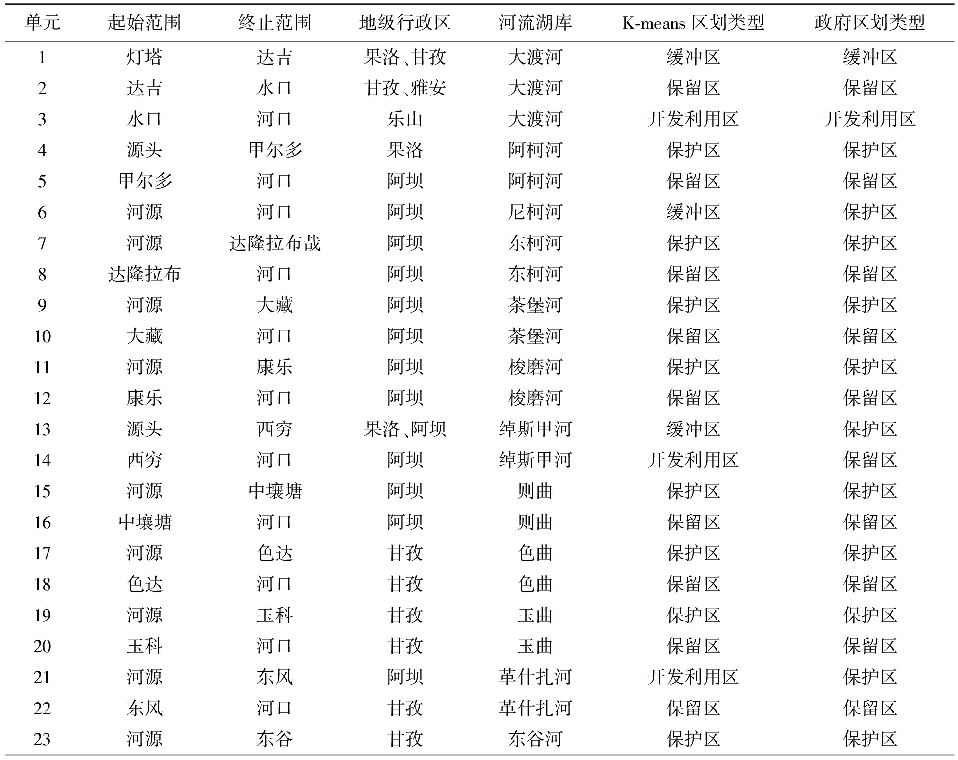 单元起始范围终止范围地级行政区河流湖库K-means区划类型政府区划类型1灯塔达吉果洛、甘孜大渡河缓冲区缓冲区2达吉水口甘孜、雅安大渡河保留区保留区3水口河口乐山大渡河开发利用区开发利用区4源头甲尔多果洛阿柯河保护区保护区5甲尔多河口阿坝阿柯河保留区保留区6河源河口阿坝尼柯河缓冲区保护区7河源达隆拉布哉阿坝东柯河保护区保护区8达隆拉布河口阿坝东柯河保留区保留区9河源大藏阿坝茶堡河保护区保护区10大藏河口阿坝茶堡河保留区保留区11河源康乐阿坝梭磨河保护区保护区12康乐河口阿坝梭磨河保留区保留区13源头西穷果洛、阿坝绰斯甲河缓冲区保护区14西穷河口阿坝绰斯甲河开发利用区保留区15河源中壤塘阿坝则曲保护区保护区16中壤塘河口阿坝则曲保留区保留区17河源色达甘孜色曲保护区保护区18色达河口甘孜色曲保留区保留区19河源玉科甘孜玉曲保护区保护区20玉科河口甘孜玉曲保留区保留区21河源东风阿坝革什扎河开发利用区保护区22东风河口甘孜革什扎河保留区保留区23河源东谷甘孜东谷河保护区保护区