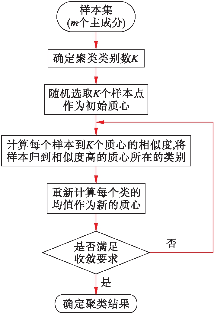 式中,dist(x,c)为样本x到质心c的欧式距离;xt与ct分别为样本x和质心c的第t个主成分.所有样本归类后重新计算每个类的均值作为新的质心,重复以上过程直到满足收敛要求,即质心不再改变或已达到规定的收敛次数,最终确定出每个样本所属的类别及每个类的质心.K-means算法流程图如图3所示.