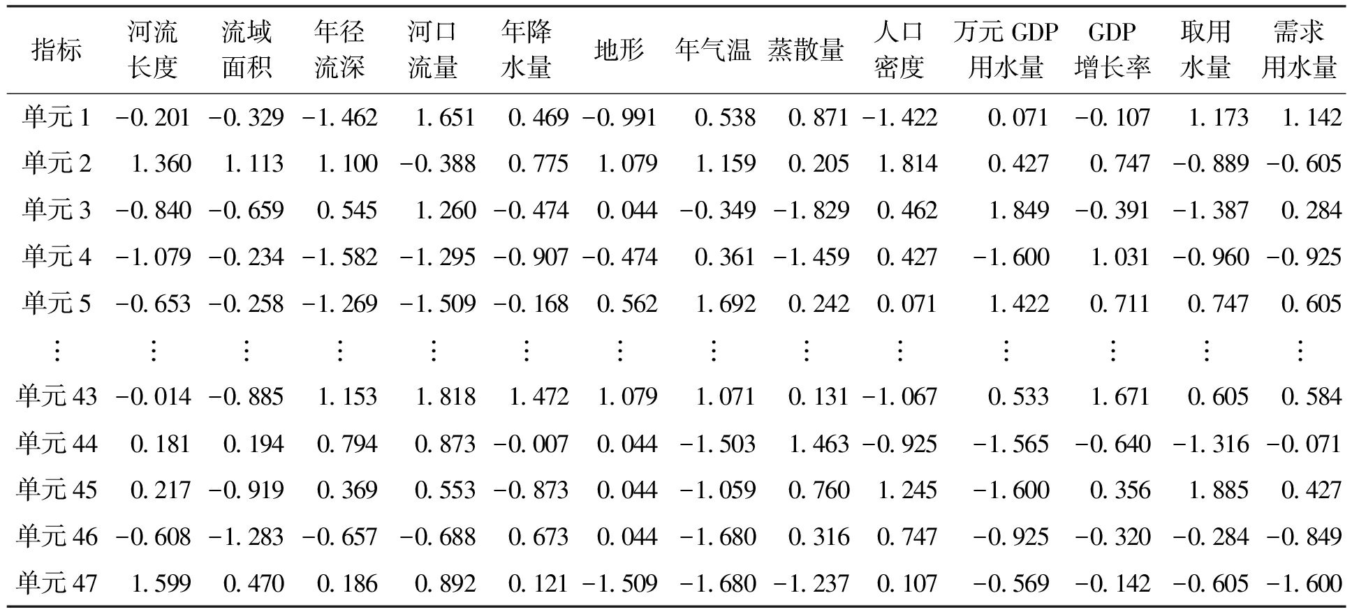 指标河流长度流域面积年径流深河口流量年降水量地形年气温蒸散量人口密度万元GDP用水量GDP增长率取用水量需求用水量单元1-0.201-0.329-1.462 1.651 0.469-0.991 0.538 0.871-1.422 0.071-0.107 1.173 1.142单元21.3601.1131.100-0.3880.7751.0791.1590.2051.8140.4270.747-0.889-0.605单元3-0.840-0.6590.5451.260-0.4740.044-0.349-1.8290.4621.849-0.391-1.3870.284单元4-1.079-0.234-1.582-1.295-0.907-0.4740.361-1.4590.427-1.6001.031-0.960-0.925单元5-0.653-0.258-1.269-1.509-0.1680.5621.6920.2420.0711.4220.7110.7470.605︙︙︙︙︙︙︙︙︙︙︙︙︙︙单元43-0.014-0.8851.1531.8181.4721.0791.0710.131-1.0670.5331.6710.6050.584单元440.1810.1940.7940.873-0.0070.044-1.5031.463-0.925-1.565-0.640-1.316-0.071单元450.217-0.9190.3690.553-0.8730.044-1.0590.7601.245-1.6000.3561.8850.427单元46-0.608-1.283-0.657-0.6880.6730.044-1.6800.3160.747-0.925-0.320-0.284-0.849单元471.5990.4700.1860.8920.121-1.509-1.680-1.2370.107-0.569-0.142-0.605-1.600