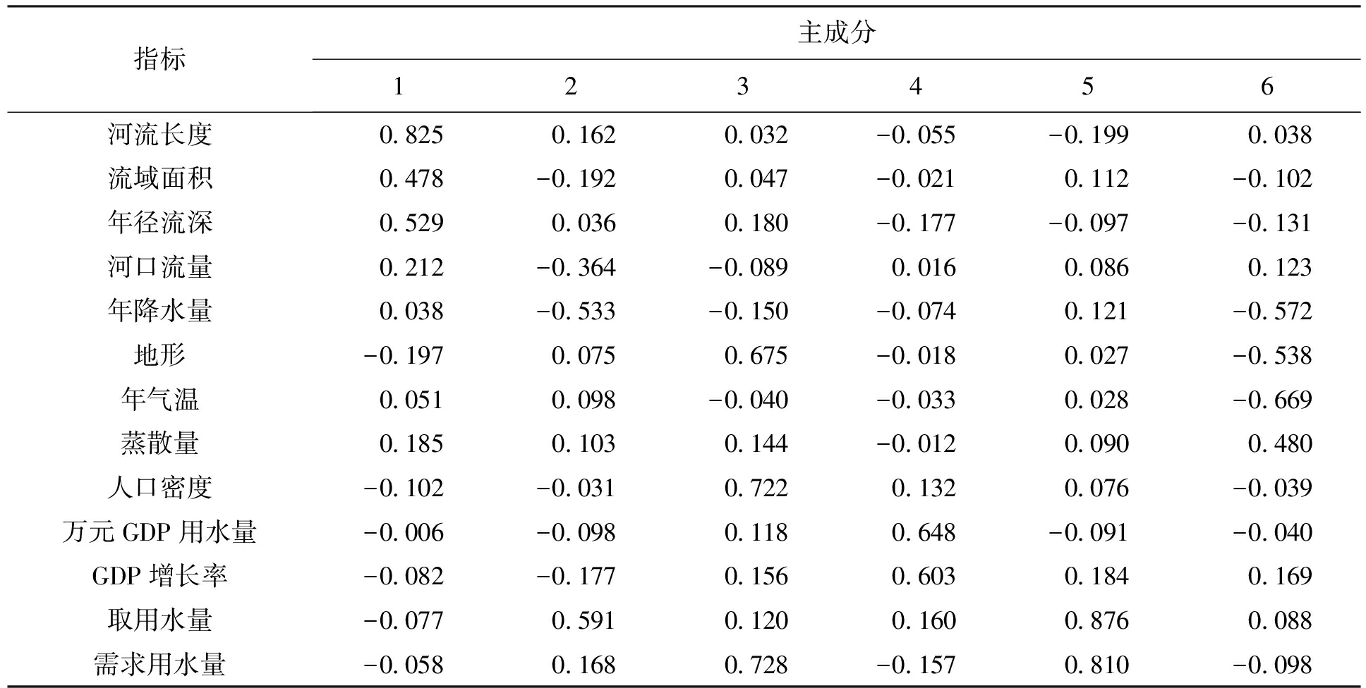 各指标在6个主成分中的相关系数如表3所示.相关系数取值范围为[-1,1],大于0表示正相关,小于0表示负相关,相关系数绝对值越接近1表示指标在主成分中影响度越大.因此,主成分1反映了水域基本属性,受河流长度、流域面积、年径流深等指标的影响;主成分2主要包括河口流量、年降水量、取用水量等指标;主成分3受人口密度、地形、需求用水量等指标的影响较大;主成分4反映社会经济现状,主要包括万元GDP用水量、GDP增长率指标;主成分5反映用水需求关系,主要包括取用水量、需求用水量指标;主成分6反映区域自然情况,主要受地形、年降水量、年气温、蒸散量指标的影响.