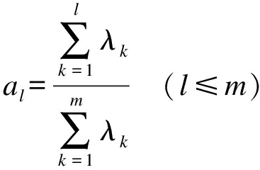 4) 计算特征值贡献率.选择一个主成分计算特征值的信息贡献率bj和累计贡献率al,其表达式分别为
