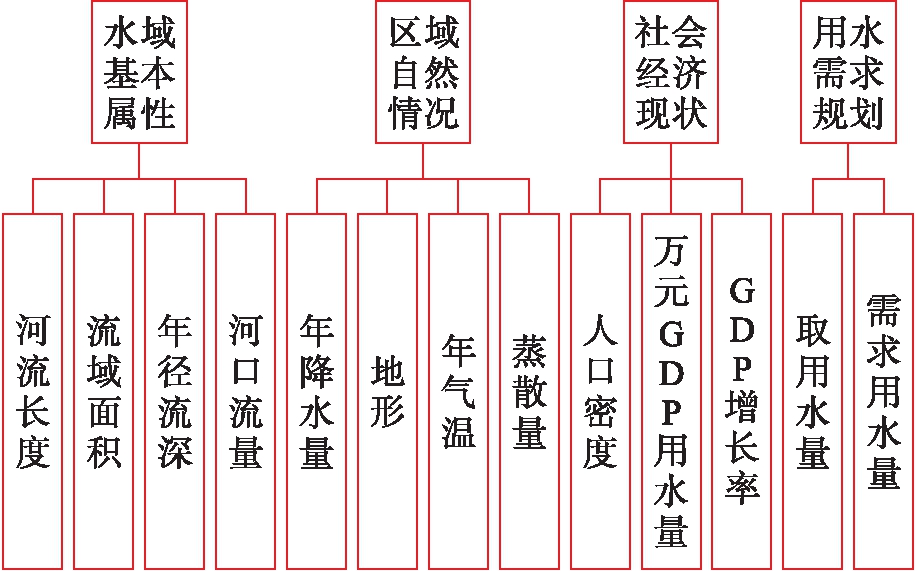 指标体系构建[10-11]是聚类分析过程中的基础环节,有助于对非线性复杂系统特征进行分析,且关系到水资源功能区划结果的科学性与规范性.影响水资源系统的因子较多,区划考虑的因子越多,区划则越复杂;区域内的差异越大,区划也越困难.合理的指标体系有利于设计和重构复杂的系统,使区域特征能够客观、规范、合理地进行描述和展示.