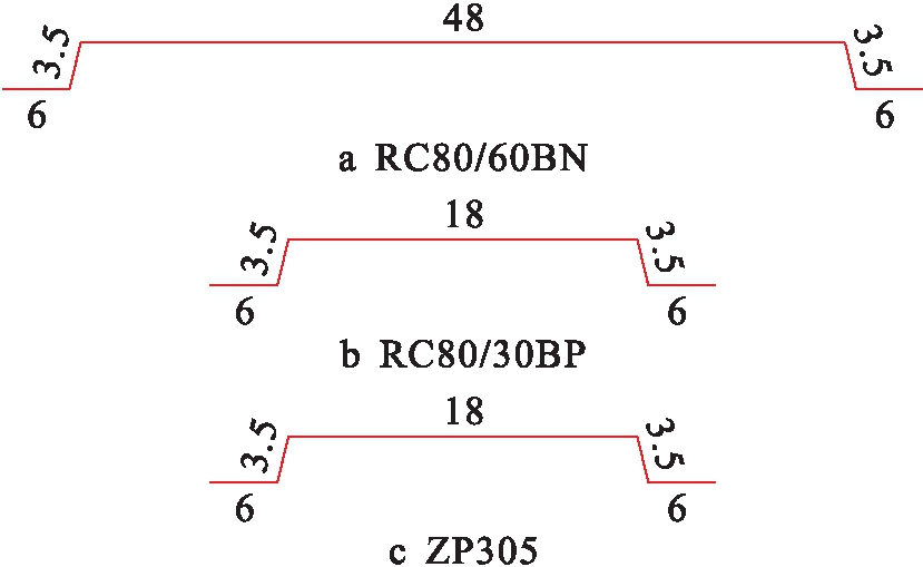 Dinh[8]进行的钢纤维混凝土梁抗折试验共包含12根C40尺寸为15.24 cm×15.24 cm×50.8 cm试件,其钢纤维体积含量Vf均为0.75%.12根试件分为3组,每组构件4根,分别对应三种端钩型纤维:组Ⅰ,RC80/60BN,长lf=60 mm,直径df=0.75 mm,强度fsft=1 050 MPa;组Ⅱ,RC80/30BP,长lf=30 mm,直径df=0.38 mm,强度fsft=2 300 MPa;组Ⅲ,ZP305,长lf=30 mm,直径df=0.55 mm,强度fsft=1 100 MPa.其中,ZP305和RC80/60BN为常规强度纤维,常用于传统的SFRC中.RC80/30BP纤维具有2 300 MPa强度,适用于高强度混凝土中.ZP305纤维的长径比(lf/df=55)小于RC80/60BN和RC80/30BP纤维的长径比(lf/df=80),具体尺寸形式如图1所示(单位:mm).