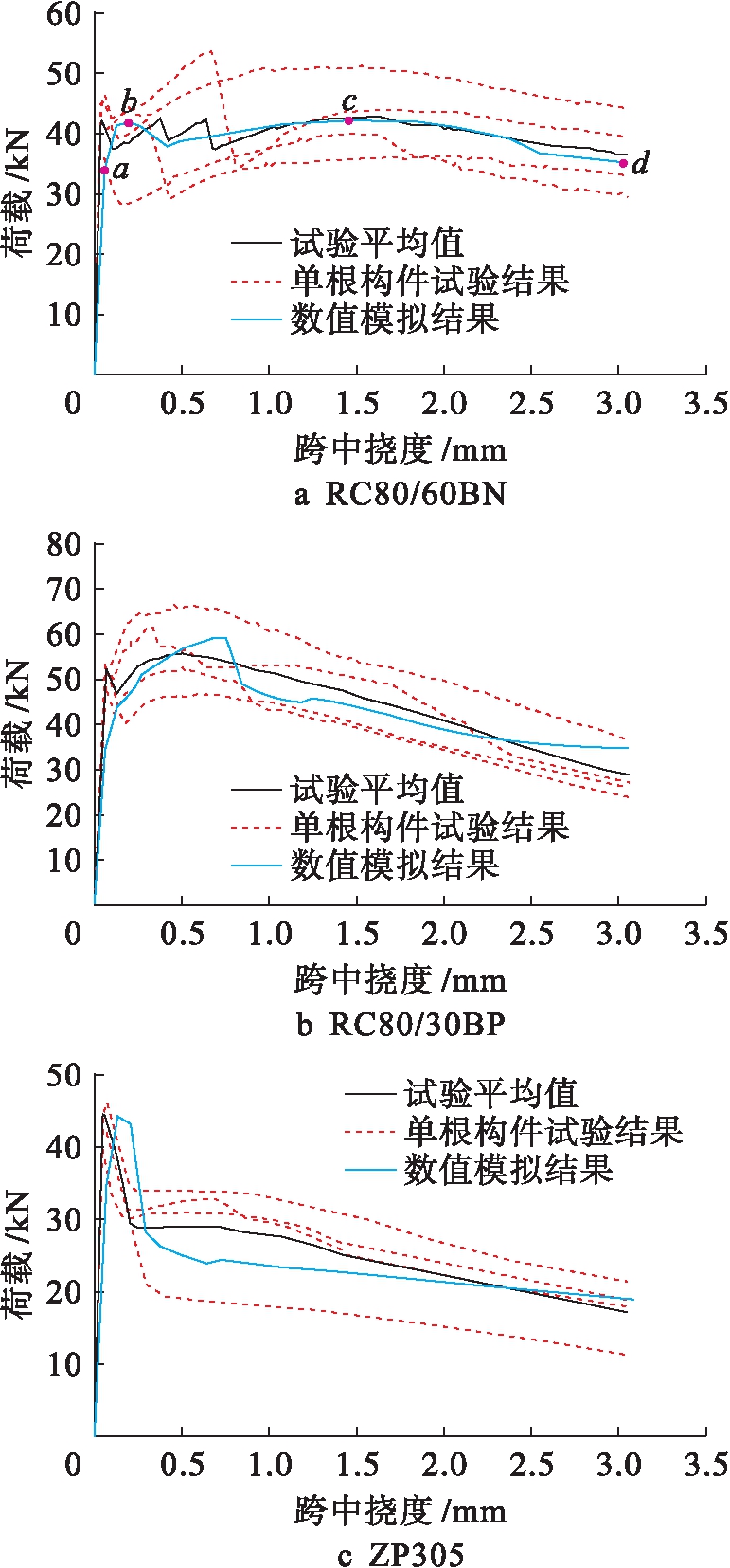 图9 各型钢纤维混凝土梁试验结果与模拟结果对照