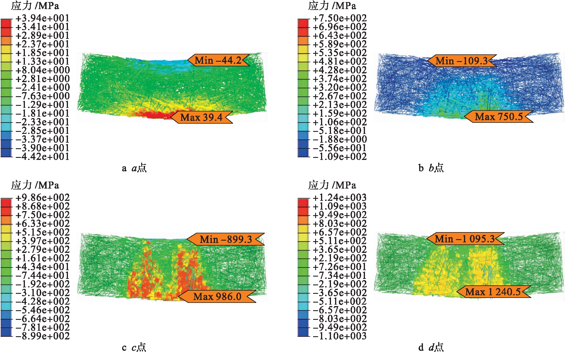 SFRC三维细观尺度的数值模拟由于采用宏观混凝土与细观钢纤维相结合的SFRC三维细观尺度数值模拟方法,因而,其计算结果可直观分析得到钢纤维在整个受力中发挥作用的过程.本文重点以组Ⅰ:RC80/60BN型钢纤维混凝土梁进行说明,如图9a所示,共选取4个特征点用来观察钢纤维应力变化的过程.具体如下:1)a点,0.8Pu点(其中,Pu为SFRC梁极限承载力);2)b点,1.0Pu点,该点为SFRC梁极限承载力所在的点;3)c点,加载至挠度为1.5 mm;4)d点:加载至挠度为 3 mm.