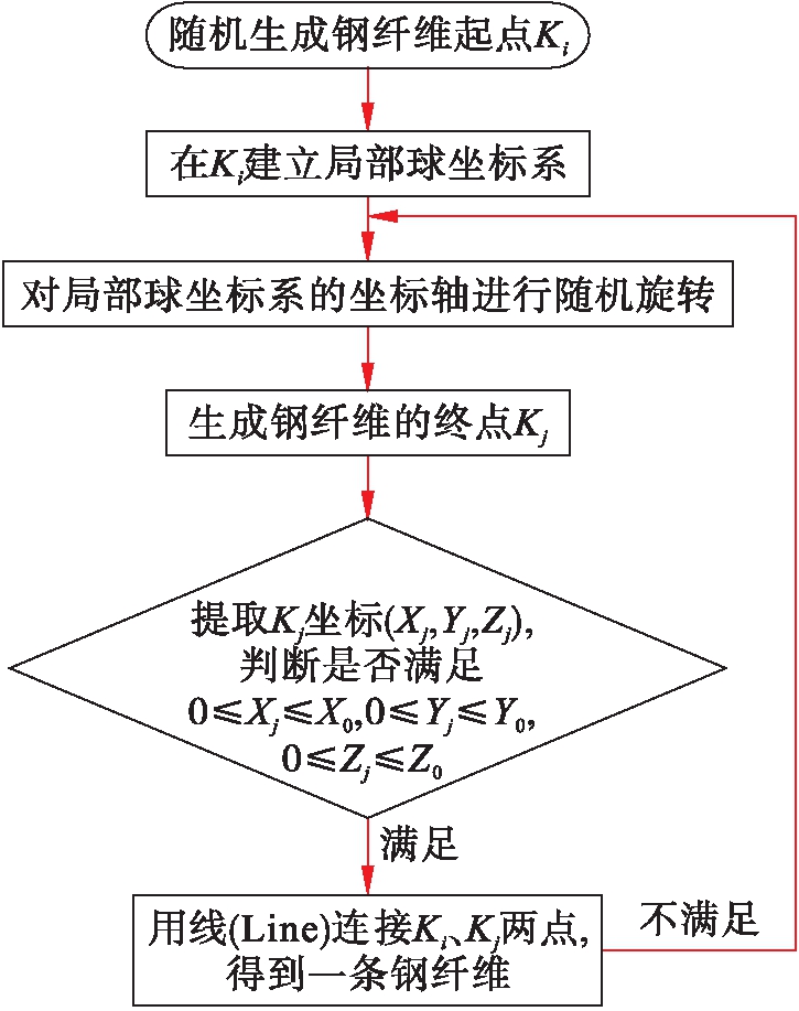 3) 在坐标轴随机旋转后的局部坐标系下,在其X′轴上、距离Xi为lf的位置上生成钢纤维的终点Kj;提取该点坐标,如果该点坐标超出区间,则删除该点,返回第2)步,重新旋转局部坐标系,生成新的Kj点,直至Kj点满足0≤Xj≤X0,0≤Yj≤Y0,0≤Zj≤Z0为止,如图3c所示.