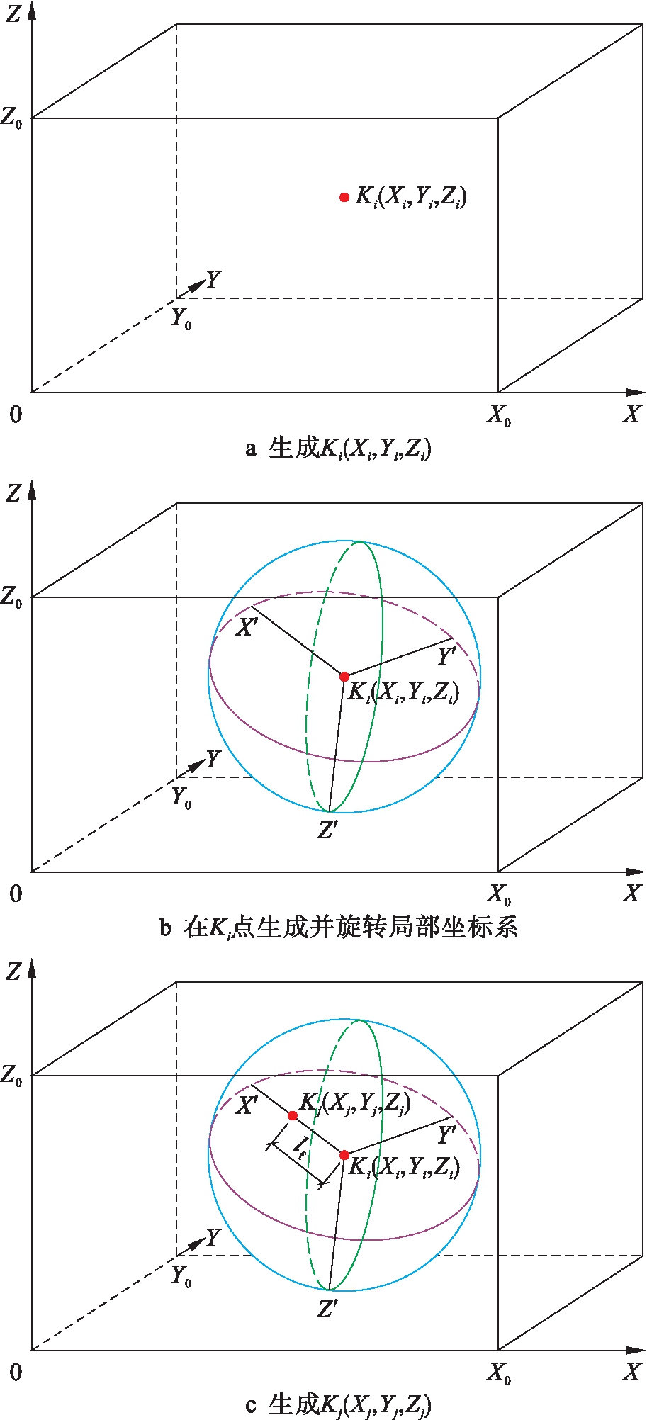 1) 在指定空间范围{0,X0;0,Y0;0,Z0}内,采用RAND随机函数在指定空间中首先生成一个随机关键点Ki,作为该条钢纤维的起点,如图3a所示,其中,(Xi,Yi,Zi)为采用随机函数RAND生成的随机数,随机数Xi、Yi、Zi的生成区间分别为0≤Xi≤X0、0≤Yi≤Y0、0≤Zi≤Z0.