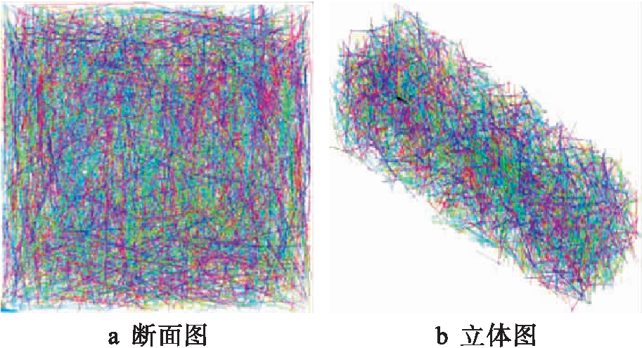 图5为采用该程序在基体尺寸为15.24 cm×15.24 cm×50.8 cm的混凝土试件中生成体积含量为0.75%的RC80/60BN型的3 338根钢纤维(lf=60 mm).从钢纤维生成的结果来看,达到了钢纤维在基体随机生成的目的,整体分布情况良好.