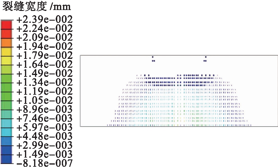 宏观混凝土与细观钢纤维相结合的SFRC三维细观尺度数值模拟方法,在应用混凝土的总应变裂缝模型后,同样也能较好地反映结构裂缝发生及发展过程.图11为b点时梁体裂缝发展图.由分析结果得到,梁体的最大裂缝宽度为0.024 mm.