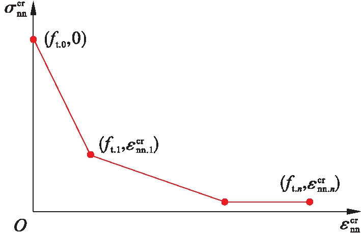 对于总应变裂缝模型中混凝土的受拉模型,在Midas/FEA中提供了常量模型、弹性模型、脆性模型、线性模型、指数模型、Hordijk模型、多线性模型等.本文采用多线性模型进行数值模拟,超过抗拉强度时按照用户定义的折线发生软化[9],如图8所示.最多可以输入30个点的坐标,第一个坐标必须是(0,0).