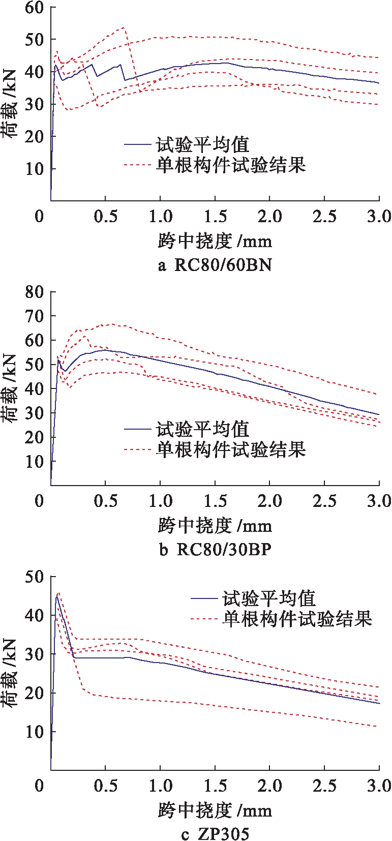试验采用四点弯曲测试装置,两点加载,加载速率为0.127 mm/s,最后加载到跨中挠度为3.048 mm时终止.对每组单根构件的试验结果加权平均绘制荷载位移曲线,如图2所示.