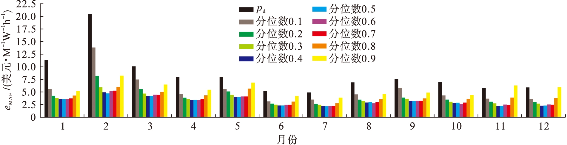 本节将从统计角度对所提出的预测模型准确性进行分析.使用2015年安大略省电价数据进行测试,同时使用2012~2014年的数据进行训练和验证.评估使用平均绝对误差(MAE)作为误差度量,月度平均绝对误差eMAE如图4所示.在0.1~0.9共9个分位数中,第5个分位数的eMAE总和是最小的,而几乎所有的9个分位数预测均能获得比pd更优的表现.虽然0.9分位数在11月和12月比pd差,但其平均值的表现较为理想.