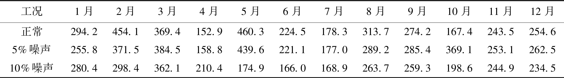 工况1月2月3月4月5月6月7月8月9月10月11月12月正常294.2454.1369.4152.9460.3224.5178.3313.7274.2167.4243.5254.65%噪声255.8371.5384.5158.8439.6221.1177.0289.2285.4369.1253.1262.510%噪声280.4298.4362.1210.4174.9166.0168.9263.7259.3198.6244.9234.5
