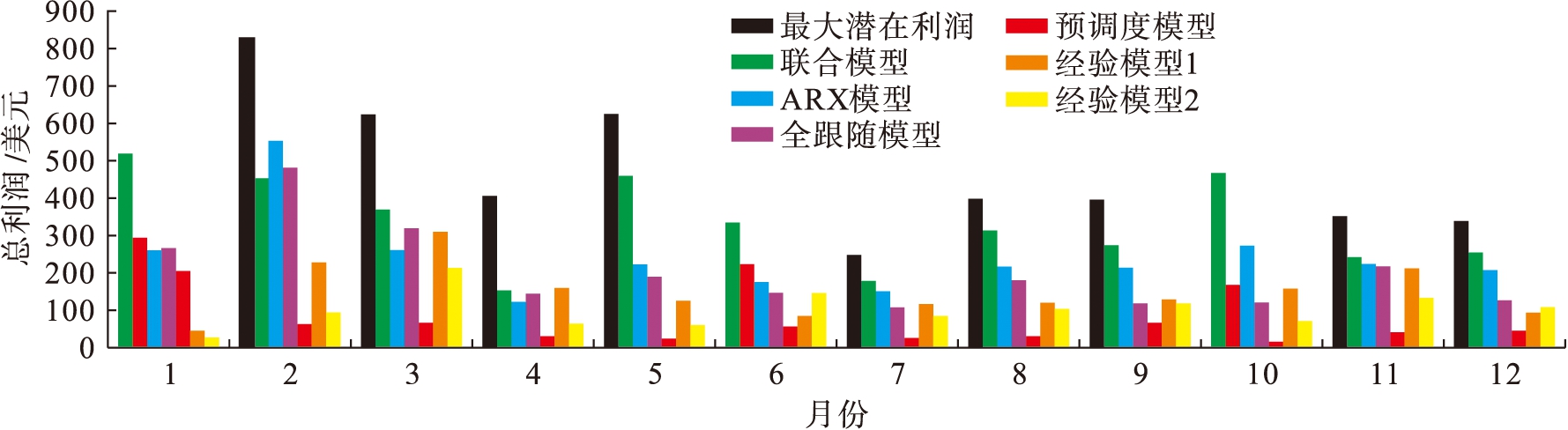 在本实验中,计算了上述6种模型的月潜在利润,如图7所示.2015年的最大潜在利润合计约为5 532美元,应用本文的联合模型可捕获61.23%的潜在利润(合计3 387美元),相比于ARX模型提升了9.1%.ARX模型最终节省的价格是2 884美元,因为ARX的精度较低,阈值策略也有所影响.文中所提出的模型结果优于全跟随模型的结果(合计2 422美元),证明其有效克服了跟随效应.预调度模型是一种小时粒度模型,其结果并不理想(共679美元).与使用5 min粒度数据的模型相比,小时级预调度模型的利润率较低,这体现了使用细粒度数据的有效性.两种经验模型的总利润分别为1 787美元和1 229美元.