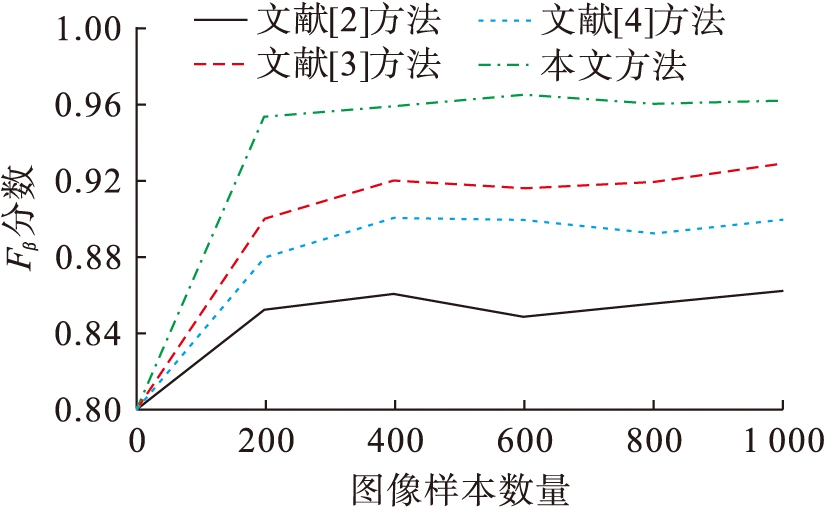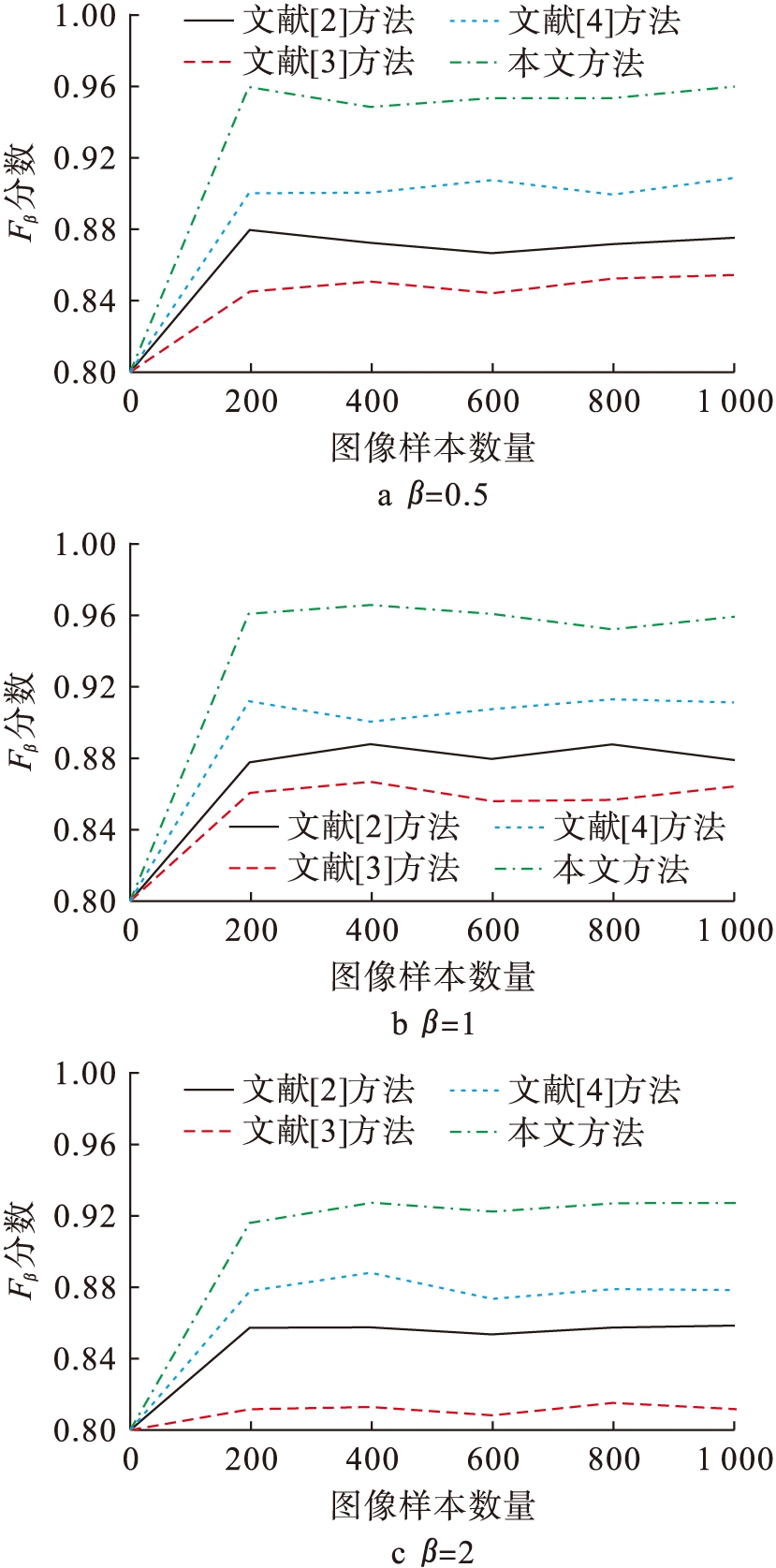 采用本文方法和文献[2]、文献[3]以及文献[4]方法对图像集进行目标检测,得到静态图像在β=0.5、1、2时的Fβ分数,如图1所示.