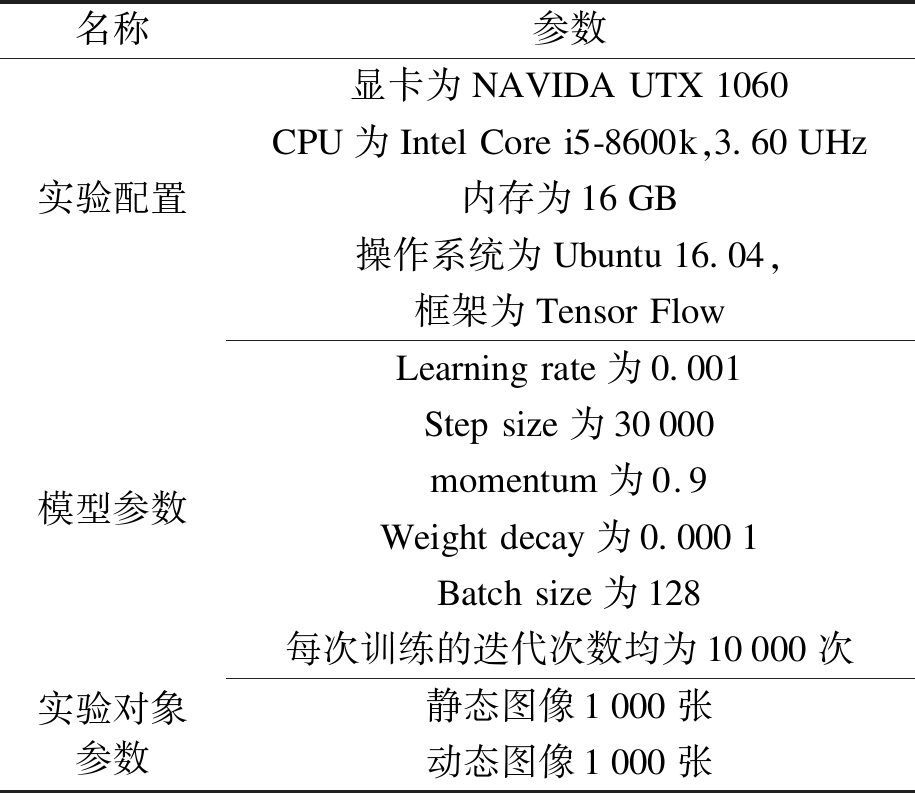名称参数实验配置模型参数实验对象参数显卡为NAVIDAUTX1060CPU为IntelCorei5-8600k,3.60UHz内存为16GB操作系统为Ubuntu16.04,框架为TensorFlowLearningrate为0.001Stepsize为30000momentum为0.9Weightdecay为0.0001Batchsize为128每次训练的迭代次数均为10000次静态图像1000张动态图像1000张