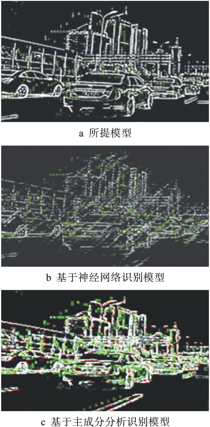 为了验证所提出的基于射频技术的高速运动图像自动识别模型的综合有效性,需要对其模型进行测试.本次测试的操作系统为Windows7,内存容量为24 GB,采用i-SPEED 210/211超高速视频摄像机在某限速为129 km/h的路段采集600组高速行驶车辆图像,图像采集速度为300 000帧/s,分辨率为4 096×2 440,400万像素.将基于神经网络的高速运动图像自动识别模型、基于主成分分析的高速运动图像自动识别模型与所提模型的识别效果进行对比,结果如图3所示.