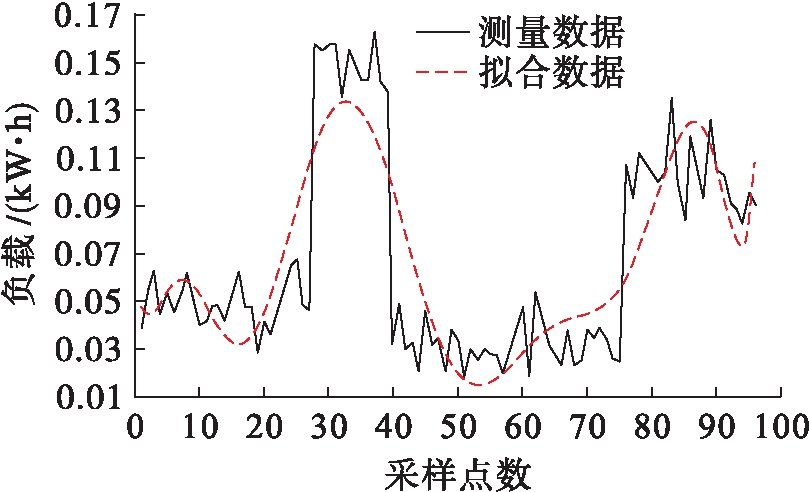 本文通过某电网公司提供的居民负荷数据来评价方法的短期负荷预测性能,采集了某电网公司所属供电公司2019年春季500户居民的用电数据.图1实线显示了2019年4月15日一个住宅客户的15 min间隔负载分布图.负载数据被认为是确定性部分与随机部分之和,用一个10阶多项式拟合负荷曲线.采样点的时间间隔为15 min,采样点数为96,其拟合曲线如图1虚线所示.