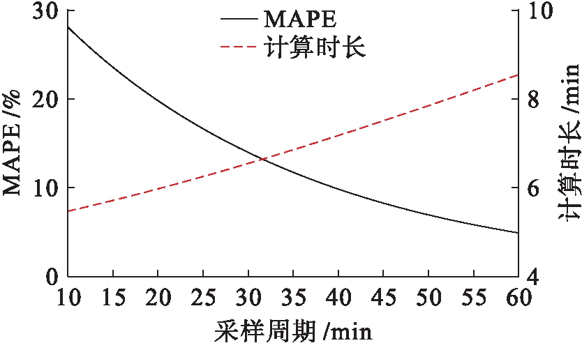 采样率对500户配电馈线预测精度和计算负荷的影响如图5所示.计算负荷是按顺序处理500个测量数据所需的总时间.由图5可以看出,当采样间隔为32 min时,计算效能和精度能够达到最优解.