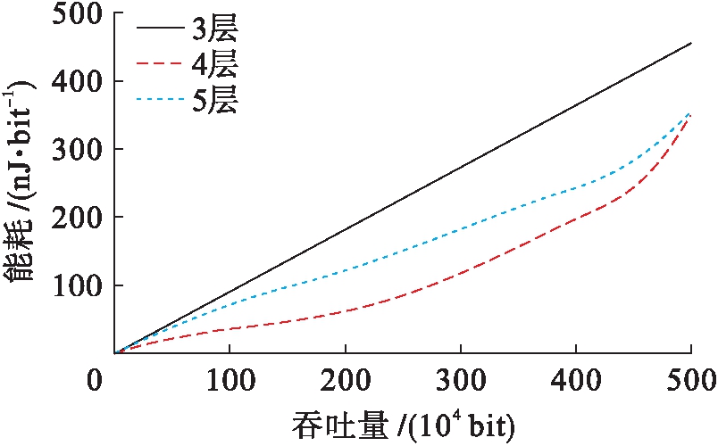 实验分别模拟3~5层异构无线传感器网络的效果,能耗模拟结果如图4所示.