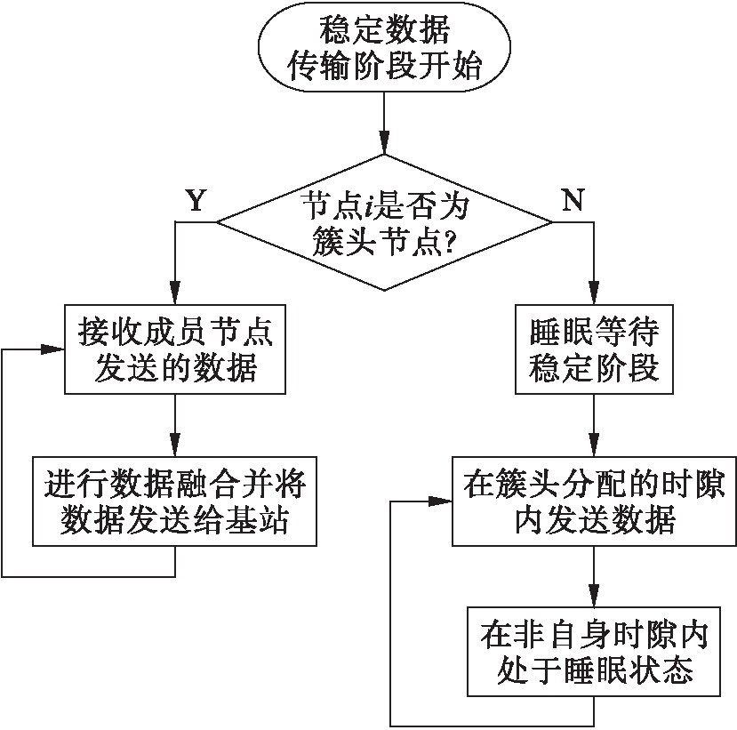当集群请求节点接收到集群头的码分多址(CDMA)码和时分多址(TDMA)时隙时,开始转发传输数据[13].节点将实时采集监控区域的数据信息,并转发到集群头.转发需要在TDMA插槽的指定时间内完成.发送后,节点进入休眠状态,以节省能量[14],集群头需要处理数据信息并发送到基站,转发数据的具体流程如图3所示.当基站完成数据信息收集后,异构无线传感器网络将进行下一轮数据信息的收集.