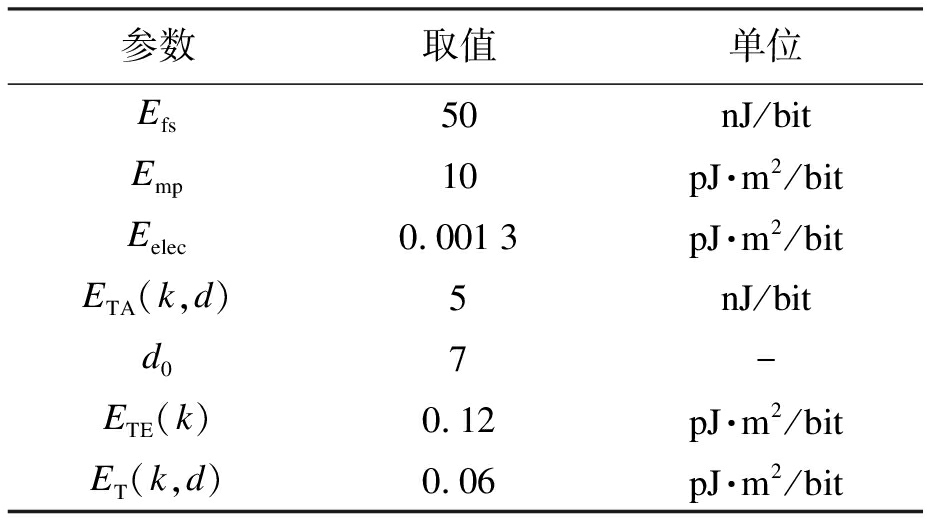 式中:ETA(k,d)为k bit数据进行转发时无线电信号经过距离d的能量消耗;ETE(k)为传输电路对k bit数据进行转发时能量的消耗;Eelec为异构无线传感器节点接收或转发单位比特数据消耗的能量;Efs为自由空间模型对应的放大器传输能耗参数[7];Emp为多路径衰落模型对应的放大器传输能耗参数[8].