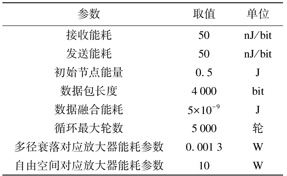 参数取值单位接收能耗50nJ/bit发送能耗50nJ/bit初始节点能量0.5J数据包长度4000bit数据融合能耗5×10-9J循环最大轮数5000轮多径衰落对应放大器能耗参数0.0013W自由空间对应放大器能耗参数10W