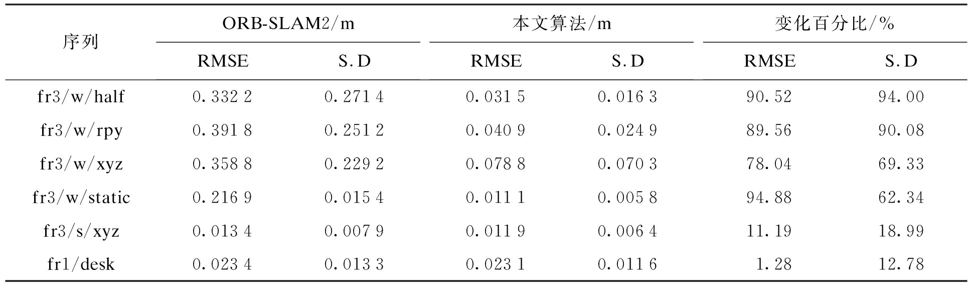 由表1~3结果可知,在六个运动序列实验中,fr1/desk序列属于静态序列,对比ATE和RPE指标可知,本文所提算法的均方根误差和标准偏差均变化不大,可以看出本文算法和ORB-SLAM2算法的估计结果非常相似,保持在同一个精度水平.fr3/s/xyz序列属于小范围动态环境,对比ATE和RPE指标可知,本文所提算法的均方根误差和标准偏差均略有下降,可以看出本文算法的定位精度略优于ORB-SLAM2算法.