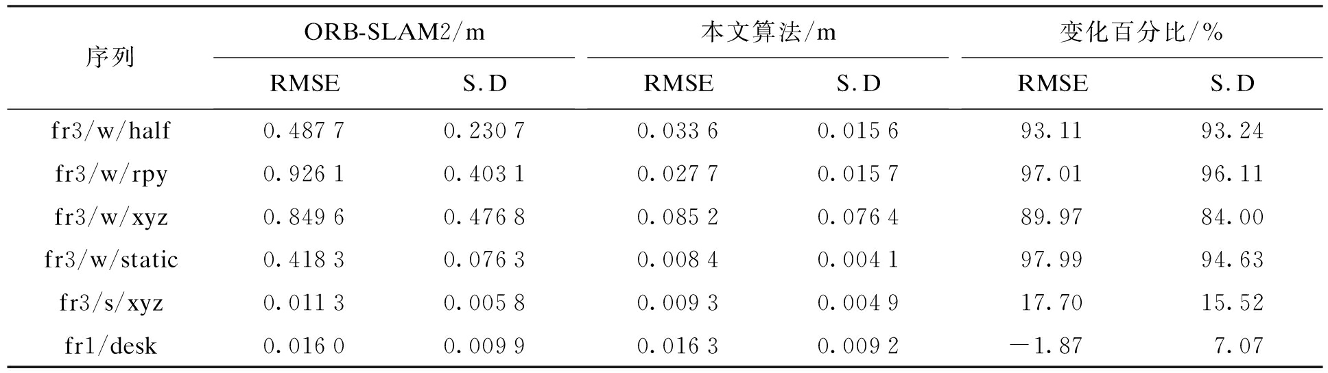 序列ORB-SLAM2/mRMSES.D本文算法/mRMSES.D变化百分比/%RMSES.Dfr3/w/half0.33220.27140.03150.016390.5294.00fr3/w/rpy0.39180.25120.04090.024989.5690.08fr3/w/xyz0.35880.22920.07880.070378.0469.33fr3/w/static0.21690.01540.01110.005894.8862.34fr3/s/xyz0.01340.00790.01190.006411.1918.99fr1/desk0.02340.01330.02310.01161.2812.78