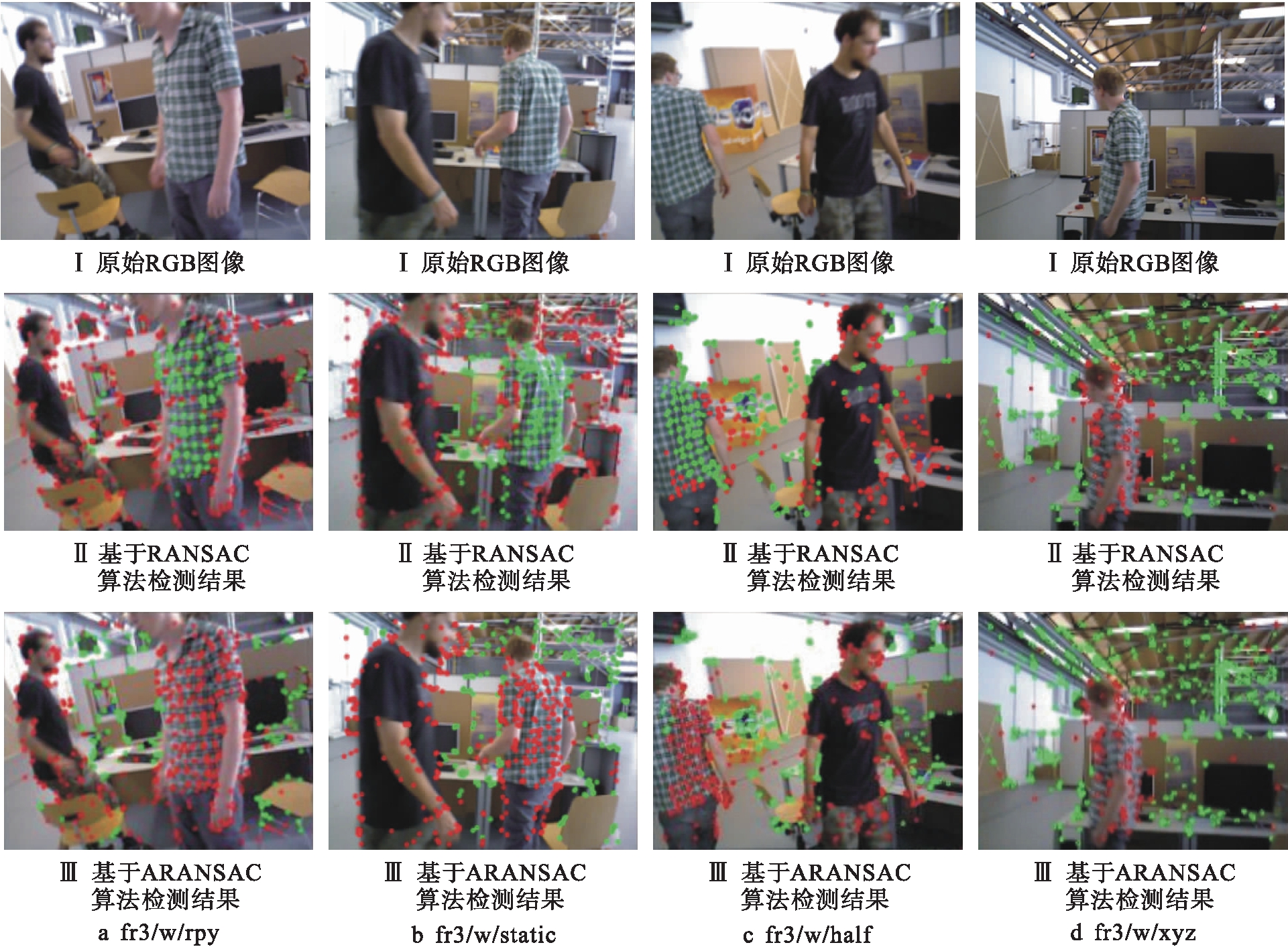 本文提出的基于ARANSAC动态特征点检测算法的目标是从所有提取的特征点中正确区分出场景中的动态特征点.为了验证该算法的有效性,分别从TUM数据集中的fr3/w/rpy、fr3/w/static、fr3/w/xyz和fr3/w/half序列选取连续两帧图像(图像中的两个人正在桌子前行走,位置不断变化)进行实验,并与基于RANSAC的检测算法进行对比,结果如图2所示.