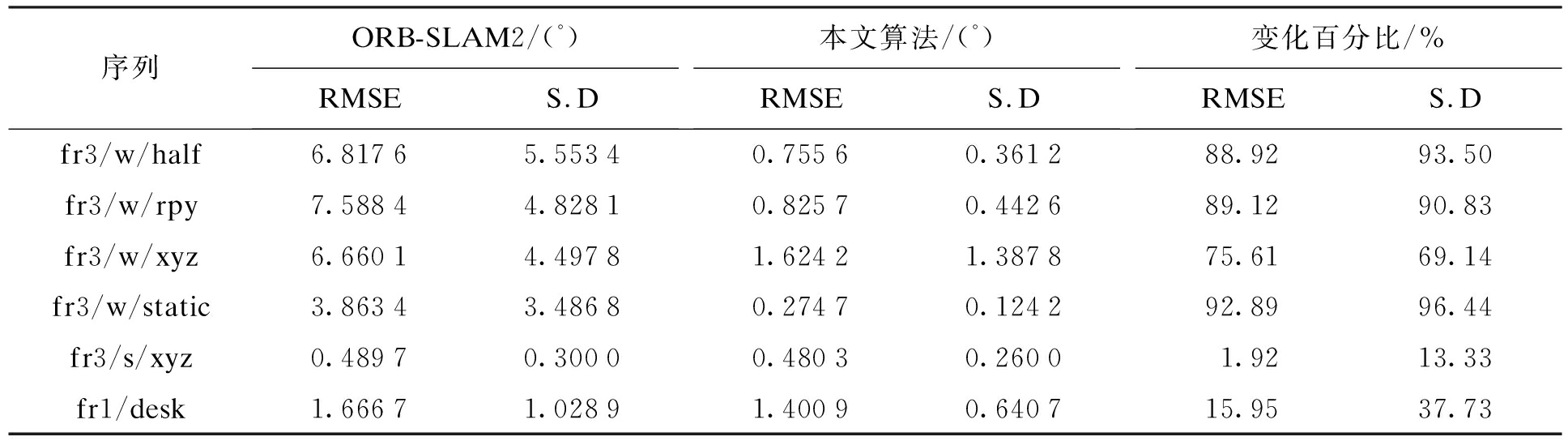 序列ORB-SLAM2/(°)RMSES.D本文算法/(°)RMSES.D变化百分比/%RMSES.Dfr3/w/half6.81765.55340.75560.361288.9293.50fr3/w/rpy7.58844.82810.82570.442689.1290.83fr3/w/xyz6.66014.49781.62421.387875.6169.14fr3/w/static3.86343.48680.27470.124292.8996.44fr3/s/xyz0.48970.30000.48030.26001.9213.33fr1/desk1.66671.02891.40090.640715.9537.73
