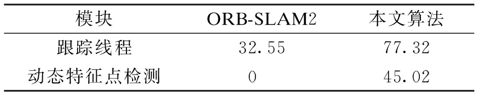 模块ORB-SLAM2本文算法跟踪线程32.5577.32动态特征点检测045.02